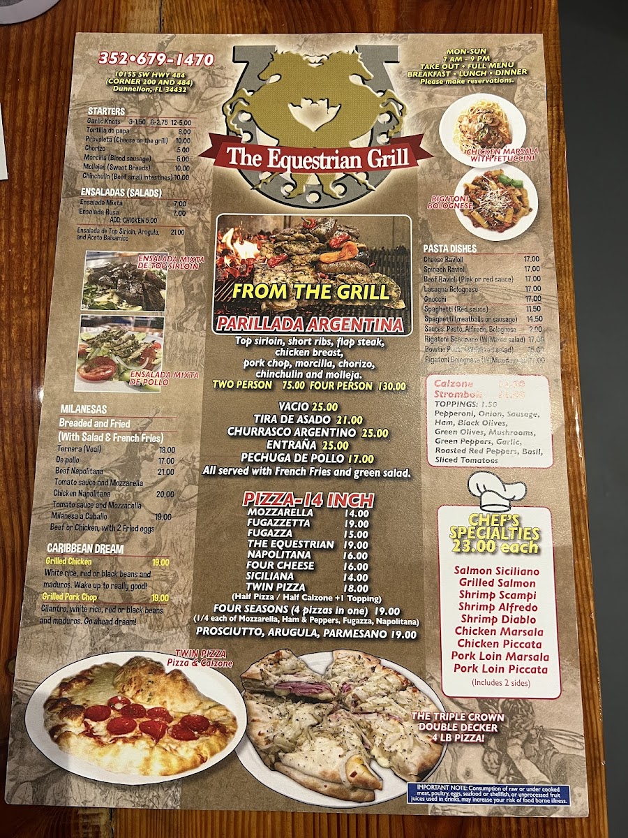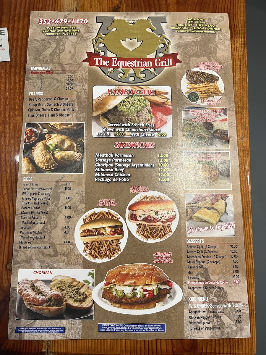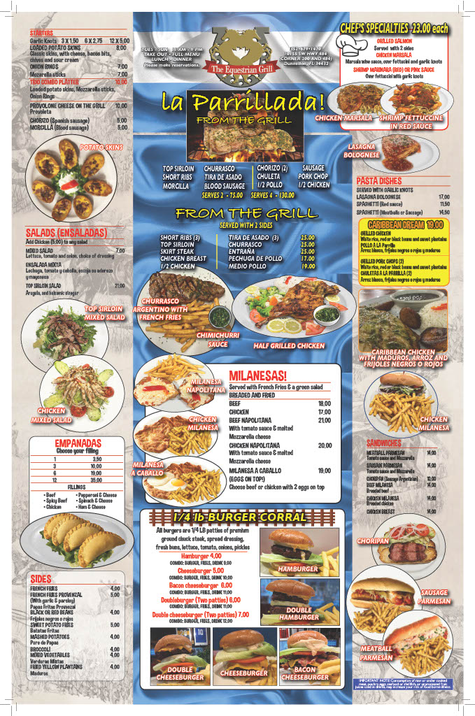 Seen through the eyes of a diner, the menu at The Equestrian Grill feels like a confident celebration of comfort food with Latin and Italian influences, carefully balanced between hearty mains and satisfying sides. The experience often begins with warm, indulgent starters like Garlic Knots, Broccoli, Croissant, or the crispy French Fries and Red Beans Cuban Style, which set a welcoming tone. Empanadas play a central role, with options such as Chicken Empanadas, Beef Empanada, and Empanada De Carne and Calzone, each delivering bold, savory flavors that reflect the kitchen’s attention to tradition. Pizza lovers are well served with distinctive choices including Argentinian Pizza, Sicilian Pizza, Shrimp Pizza, Stromboli, Calzone, and the fresh, well-balanced Prosciutto Arugula, offering variety without losing focus. For more substantial plates, classics like Lasagna, Short Ribs, Sirloin Steak with Fries, Rice and Tostones, and the generous Meat Tray stand out as filling, well-rounded meals that anchor the menu. Lighter options such as the Mediterranean Salad provide contrast and balance, making the selection approachable for different appetites. To close on a sweet note, desserts like Flan and Tiramisú bring a smooth, comforting finish that complements the savory journey. Overall, the menu feels cohesive and thoughtfully curated, with each dish contributing to a dining experience that is satisfying, flavorful, and clearly rooted in a passion for hearty, well-loved recipes.