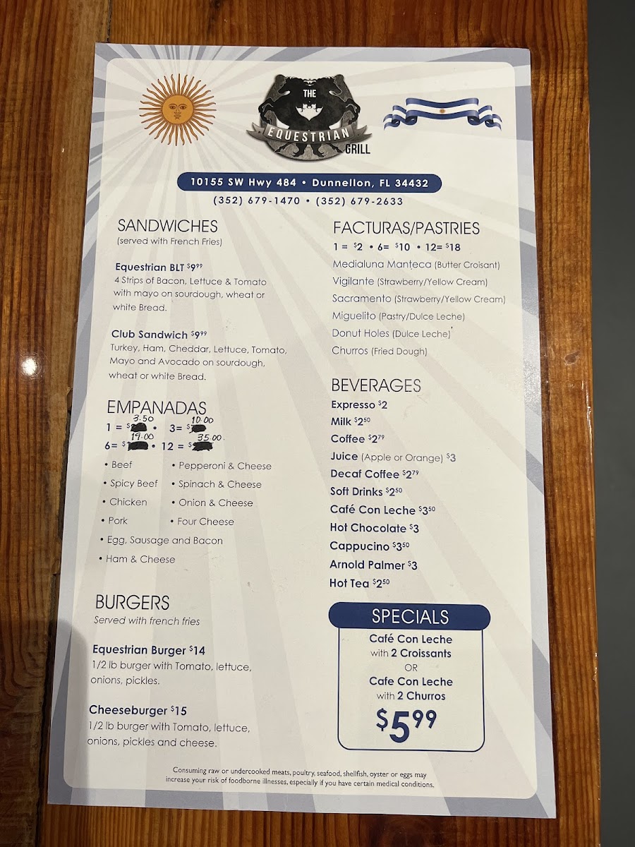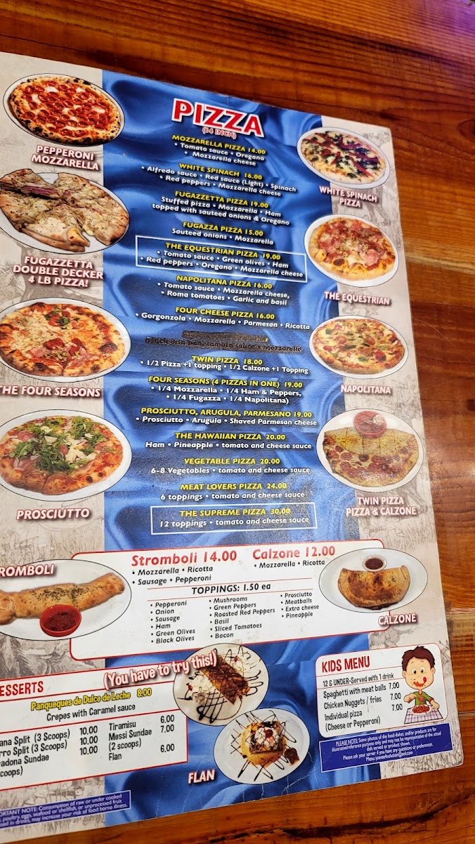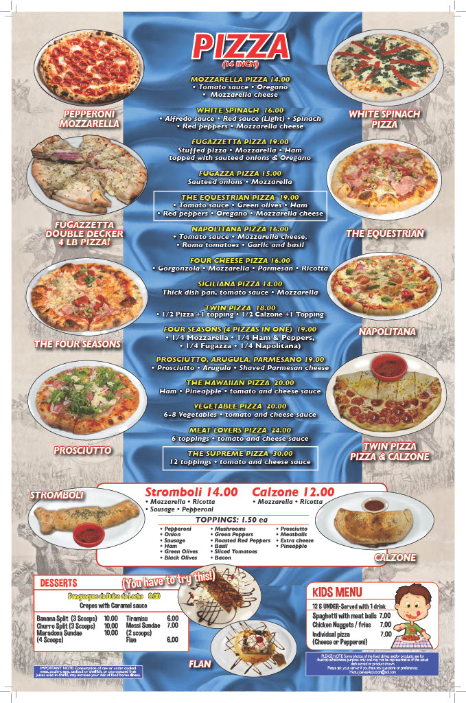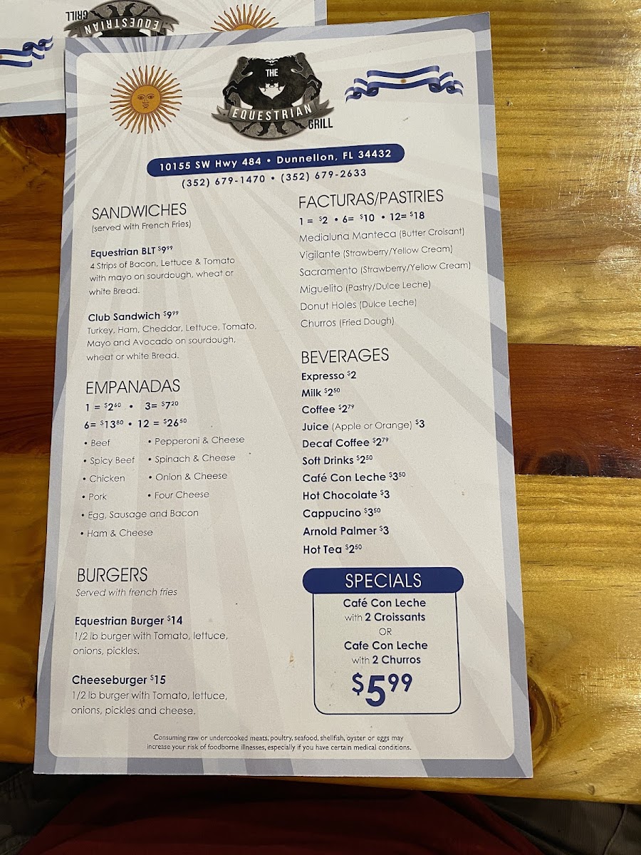 Seen through the eyes of a diner, the menu at The Equestrian Grill feels like a confident celebration of comfort food with Latin and Italian influences, carefully balanced between hearty mains and satisfying sides. The experience often begins with warm, indulgent starters like Garlic Knots, Broccoli, Croissant, or the crispy French Fries and Red Beans Cuban Style, which set a welcoming tone. Empanadas play a central role, with options such as Chicken Empanadas, Beef Empanada, and Empanada De Carne and Calzone, each delivering bold, savory flavors that reflect the kitchen’s attention to tradition. Pizza lovers are well served with distinctive choices including Argentinian Pizza, Sicilian Pizza, Shrimp Pizza, Stromboli, Calzone, and the fresh, well-balanced Prosciutto Arugula, offering variety without losing focus. For more substantial plates, classics like Lasagna, Short Ribs, Sirloin Steak with Fries, Rice and Tostones, and the generous Meat Tray stand out as filling, well-rounded meals that anchor the menu. Lighter options such as the Mediterranean Salad provide contrast and balance, making the selection approachable for different appetites. To close on a sweet note, desserts like Flan and Tiramisú bring a smooth, comforting finish that complements the savory journey. Overall, the menu feels cohesive and thoughtfully curated, with each dish contributing to a dining experience that is satisfying, flavorful, and clearly rooted in a passion for hearty, well-loved recipes.
